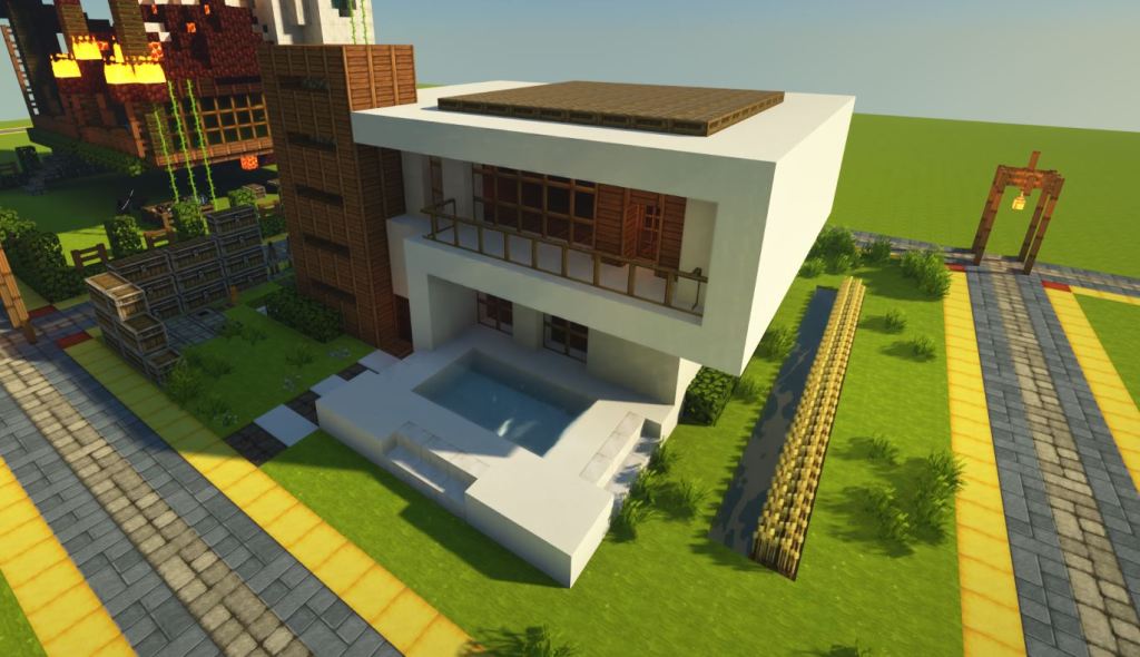 After months of collecting items and stocking up, Aidan finally created this stunning modern style house, complete with swimming pool. It’s beautiful.