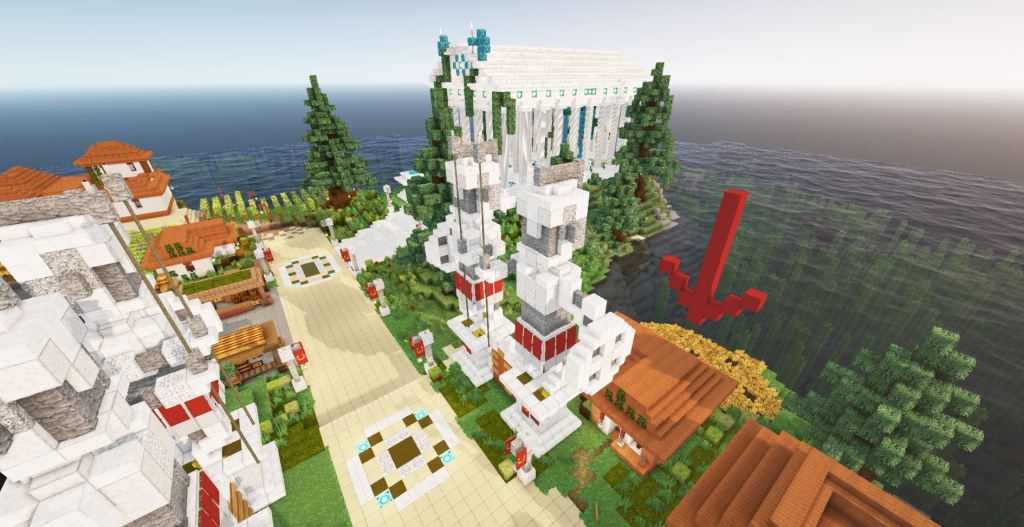 To be a part of the fun, simply place a signedbook (signed with YOUR username) into the chest that’s in the house behind the statues at 119Survival (the one with the big red arrow above it in the image below). The book must also include the coordinates of your base.