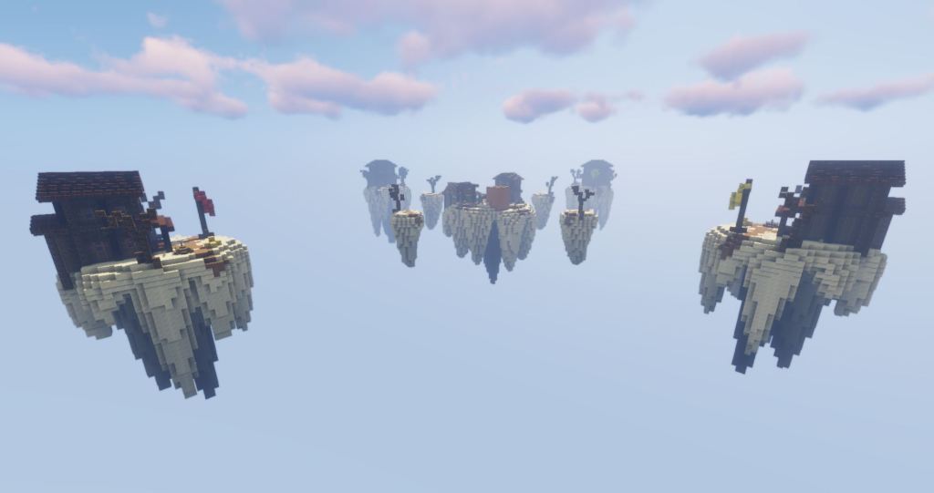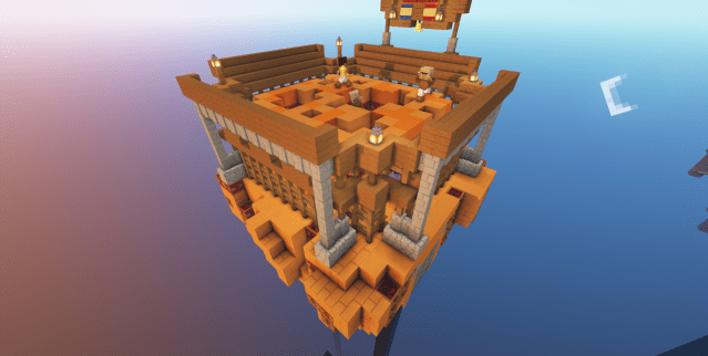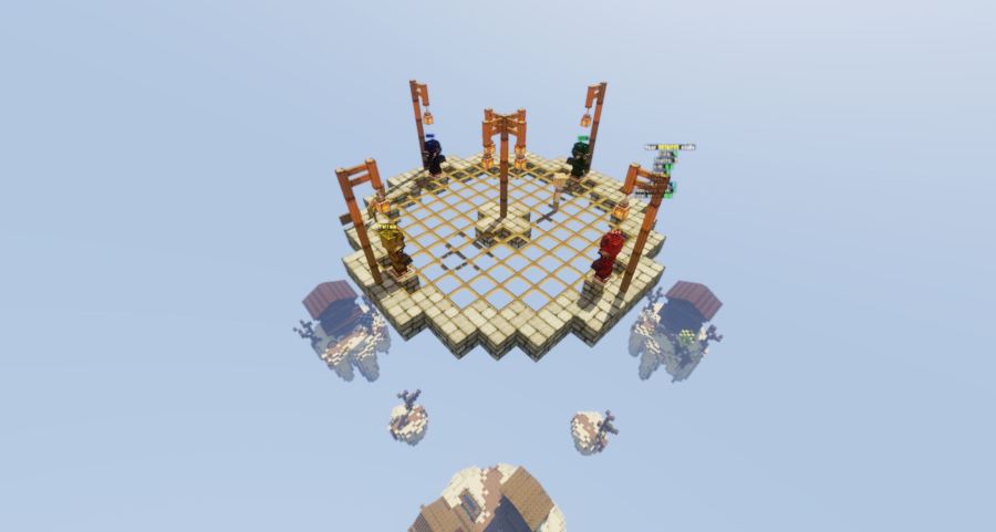 The BedWars map is set in a Western style desert town and can take 4 teamswith a maximum of2 players in each team. Each team (Red, Green, Blue and Yellow) have a bronze resource spawner, with the smaller islands in front containing an iron resource spawner. The centre island has a few gold resource spawners.