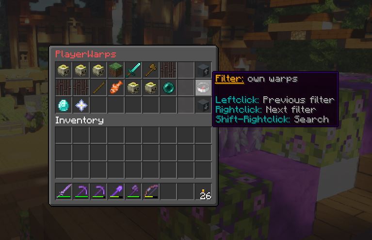 – Classes will appear first. Click on the filter you want, then click on the blue box (where the compass was). This will run the search. Any public pwarps with the matching class will appear. Players are able to set their shops, bases and farms as public warps.