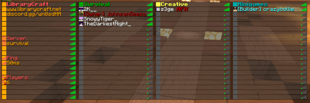 LibraryCraft is now the LibraryCraft Network (or the LCN) – we’ve moved over to a multi-server setup! Each gamemode has it’s own server. There’s a bunch of things that have changed. Read on! It’s important.